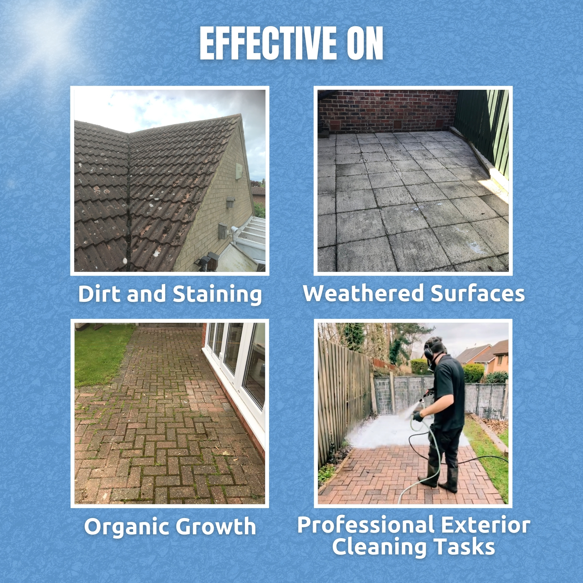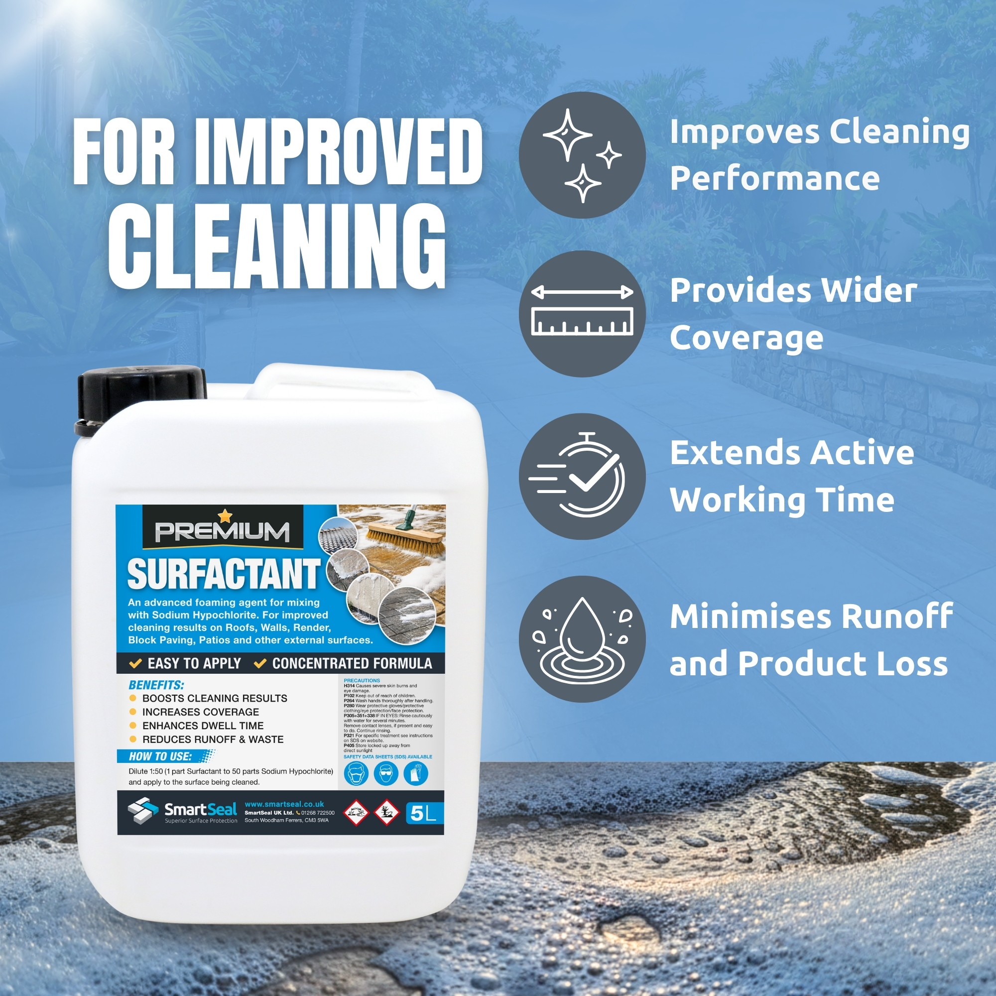 Boost the power of sodium hypochlorite with the SmartSeal Premium Surfactant. SmartSeal's specially formulated surfactant enhances coverage, improves surface wetting, and helps the Sodium Hypochlorite solution penetrate deeper, delivering faster, more effective cleaning and long-lasting results with less chemical use. The advanced foaming agent will provide improved cleaning results on Roofs, Walls, Render, Block Paving, Patios and other external surfaces.