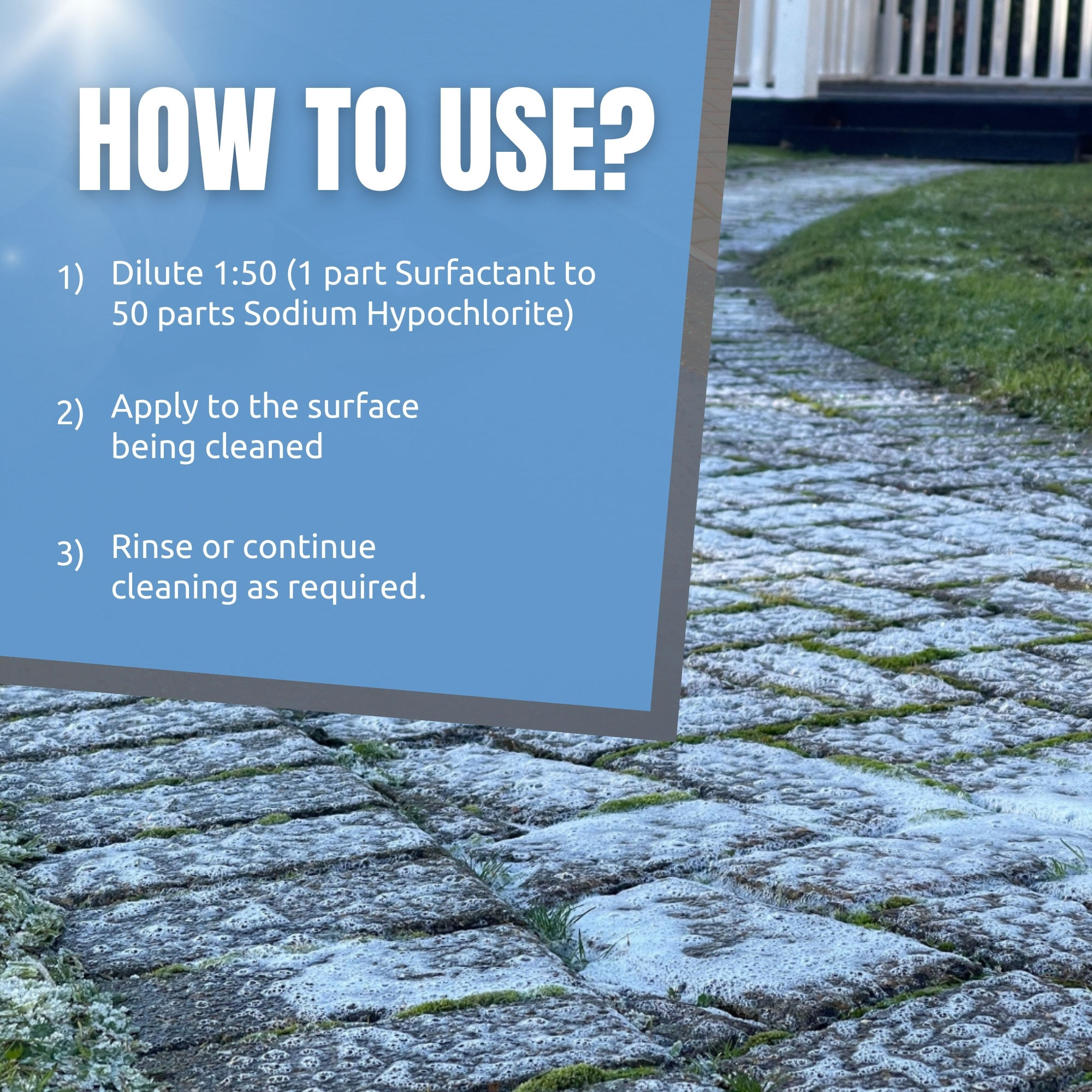 Dilute 1:50 (1 part Surfactant to 50 parts Sodium Hypochlorite) and apply to the surface being cleaned.