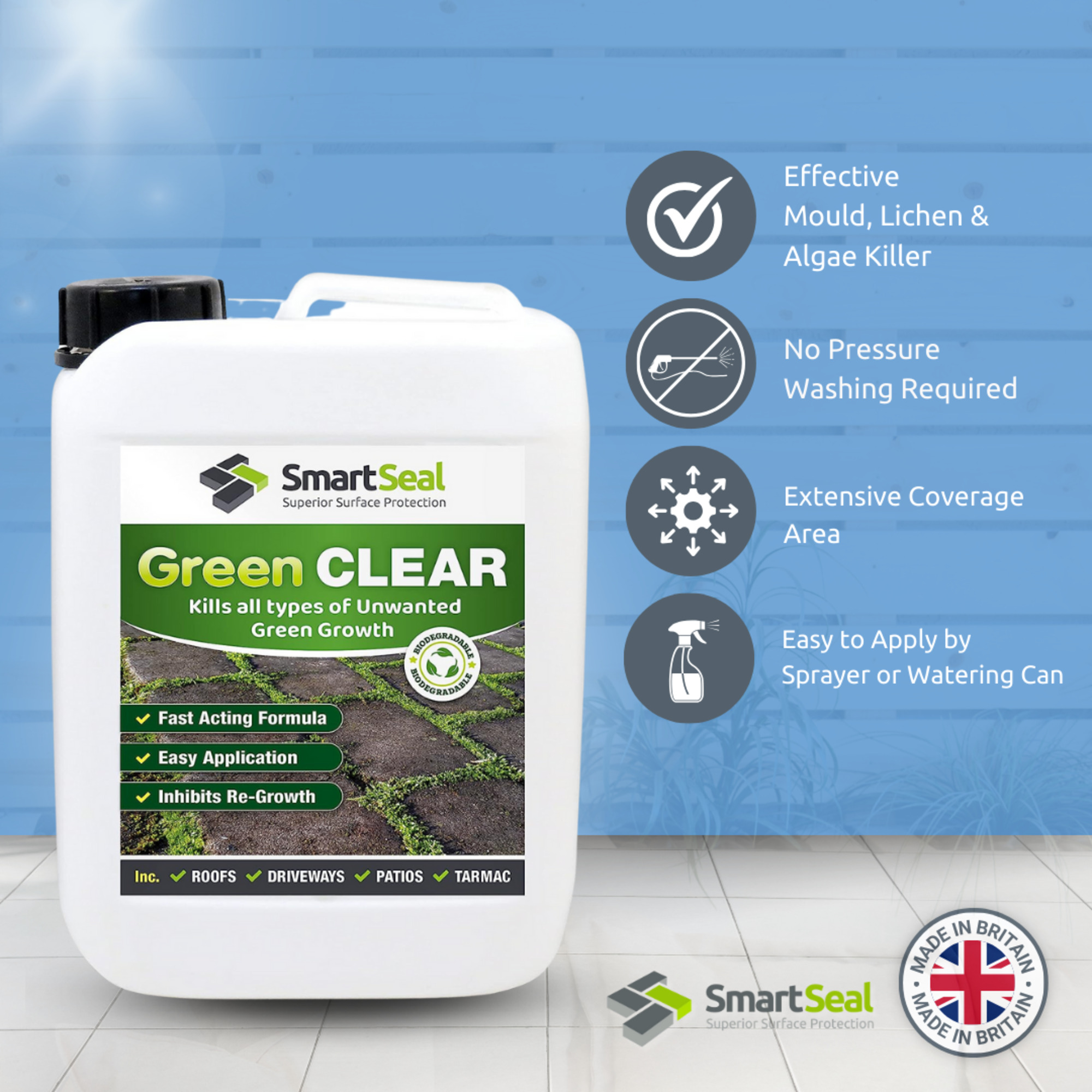 GREEN GROWTH KILLER FOR TARMAC DRIVES, PATIOS, ROOF TILES & BRICKWORK. ALSO HELPS PREVENT GREEN COMING BACK